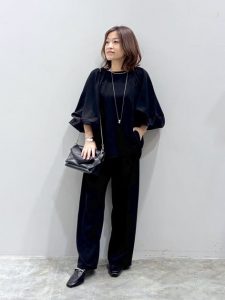 スリムなシルエットのブラックパンツは、低身長の方でも脚長効果を発揮し、バランス良く見せてくれます。