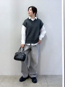 ホワイトシャツをベースに、深みのあるグレーのVネックベストを重ね着することで、シンプルながらも奥行きのあるスタイリングに仕上げています。