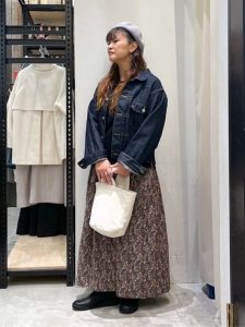 一方、柔らかな雰囲気の花柄スカートは動きのあるシルエットが女性らしさを演出し、デニムのカジュアルさと絶妙なバランスを取っています。