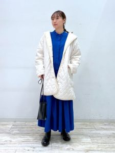 アウターにはホワイトのキルティングコートを羽織り、軽やかで暖かみのある印象をプラス。