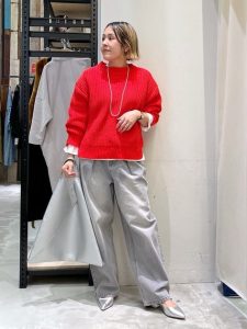 鮮やかなレッドのカラーニットは、コーディネートの主役として存在感を放ち、全体を華やかに引き立てています。