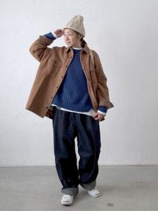 ニット×オーバーパンツ×コットンオーバージャケットの組み合わせは、メンズライクなスタイルを取り入れたレディースファッションの典型例です。
