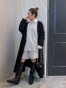 このコーディネートは、ロングカーディガンとショートパンツ、ニットセットアップを組み合わせたリラックス感とモード感が融合したスタイルです。