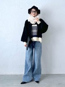 ワイドデニムパンツはゆったりとしたシルエットで、リラックス感を演出するとともに、ニットの明るい印象を引き締めています。