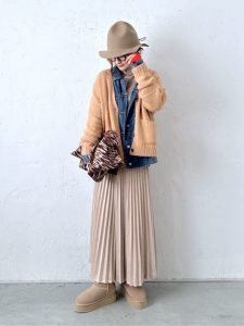 ベージュトーンのカーディガンを重ねることで、温かみのある優しい雰囲気を作り出し、秋冬らしいコーデに仕上げています。