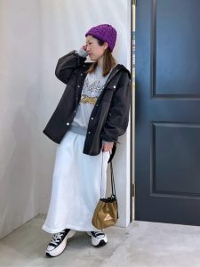 一方、ホワイトのスウェットスカートは、柔らかな素材感とリラックスしたシルエットが魅力で、デニムシャツとのコントラストが際立ちます。