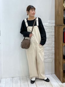 アイボリーカラーのコーデュロイサロペットは、素材感が季節感を引き立てるとともに、柔らかくナチュラルな印象を与えています。