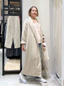 ウエストを絞らないシルエットがリラックス感を演出し、季節の変わり目にぴったりの着こなしです。