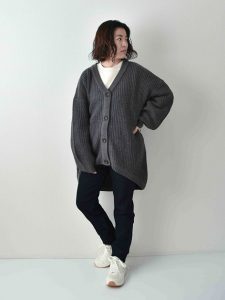 ざっくり編みのお尻までスッポリ隠れるシルエットのBIGカーディガンを羽織ったリラックススタイル。
