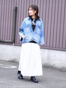 春先にぴったりのゆったりとしたシルエットのデニムジャケットと軽やかな白いロングスカートの組み合わせ。