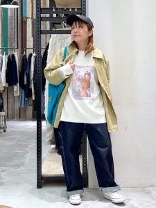 短めのトレンチコートに、ルーズなストレートパンツを合わせたリラックスコーデ。