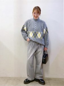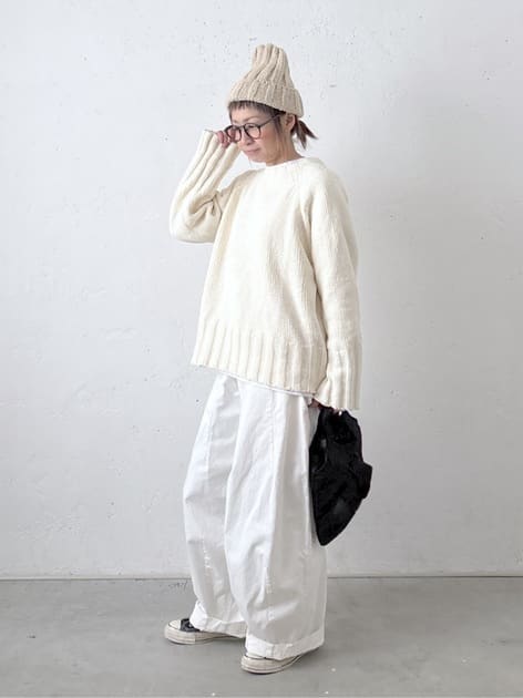 ケーブルニットにサーカスパンツを合わせたリラックスカジュアル。