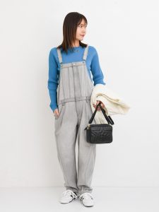 ライトグレーのサロペットを重ねた大人カジュアルコーデ。