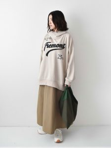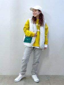 足元はスニーカーで、バッグはOLIVE×GREENカラーでアクセントをプラス。