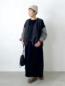 アクティブな印象を与えるキルトベストに、スウェットワンピースを合わせた軽快なスタイル。