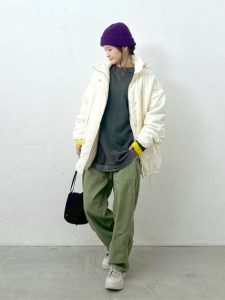 ホワイトのオーバーサイズ中綿ジャケットが、全体を明るくしつつ防寒性を確保!