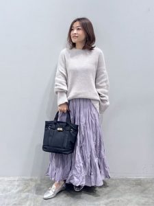 動きのある女性らしいライトパープルカラーのフレアスカートを合わせたフェミニンスタイル。