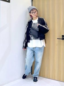 スポーティーなトラックジャケットにデニムパンツを合わせたカジュアルスタイル。