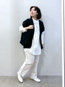 白のイージーパンツがそのシンプルさを引き立てます。