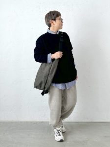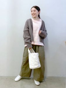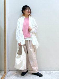 柔らかな色合いとリラックス感のあるシルエットが特徴の、大人のカジュアルスタイルです。