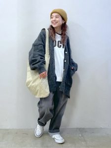 リラックス感を演出しつつ、全体に抜け感を加えるスタイリングです。