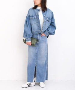 シンプルなデニムスカートは、ロング丈のタイトシルエットを選ぶことで女性らしいラインを強調し、シンプルでスタイリッシュな印象を楽しめるアイテムです。デニムには、さまざまな生地感がありますがボリューム控え目のタイトシルエットを選ぶことで、身体のラインにフィットし、脚長効果やスタイルアップを期待することができます。デニムスカートの難点は、ボリューム感ともたついた点ですよね。