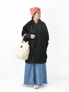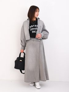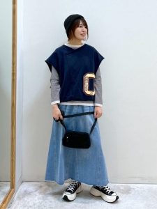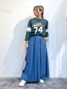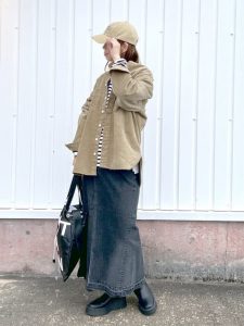 ゆったりとしたAラインシルエットですが、バックスリットがデザインされているため足さばきを気にする必要がないのではないでしょうか。寒いシーズンは、メンズライクなアウター合わせ、春にはスウェットなど、メンズライクなアイテムとコーディネートしても素敵ですよ。こちらは、オールシーズンコーディネートすることができる素材感のデニムなので活躍頻度が上がるアイテムとなる1枚でしょう。