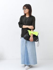 デニム素材は、さまざまなアイテムとの相性が良く、スタイリングしやすいメリットがあります。フェミンなアイテムや個性的なアイテムもデニム合わせにすることで、全体を引き締めスタイリッシュに楽しむことができますね。このようなデニムスカートだから、フレアシルエットやカラーアイテムなど個性的なアイテムを選んでみるのもおすすめ。ロング丈を選ぶことで、大人っぽい雰囲気に仕上がります。