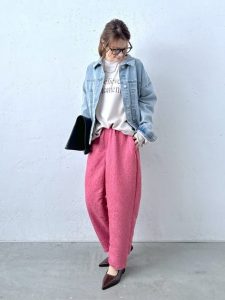 ヴィンテージデニムジャケットにカラーパンツを合わせて、トレンド感満載のカジュアルコーデに。ブラウンのレザーストラップシューズで足元を引き締め、ダテメガネをプラスして洗練された印象に。デニムとカラーのコントラストが映える、お出かけにもぴったりなスタイルです。