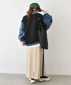 異素材の切り替えデザインがポイントのデニムジャケットに、ベージュのトラックラインスカートを合わせたスポーティーなカジュアルコーデ。リラックス感を意識しつつ、キャップとスニーカーをプラスすれば、こなれた雰囲気に。シンプルながらも遊び心のあるアイテム選びで、おしゃれにまとまるデニムジャケットコーデです。