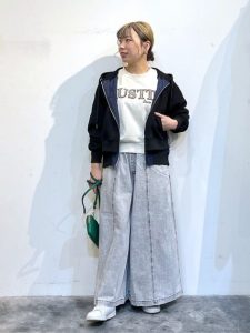 総ゴムのワイドフレアデニムは、スカートのようなシルエットです。ラメロゴ入りランタンスリーブで華やかさをプラスし、異素材切り替えの黒パーカーでメリハリを。動きやすくもスタイリッシュな大人のカジュアルコーデです。