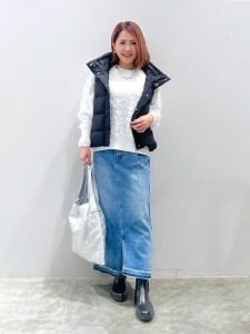 ホワイトニット×デニムスカートの組み合わせで、程よく抜け感のある大人カジュアルに。ブラックのダウンベストを羽織れば、動きやすさを残しつつも暖かみのある着こなしに。ボリュームブーツでバランスを取り、シルバーのバッグをアクセントに加えた、シンプルながらも上品に仕上げたレイヤードスタイルです。