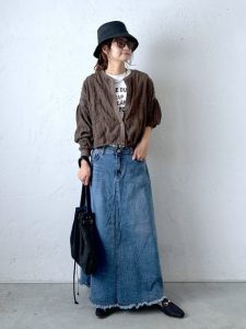 カットオフのデニムスカートに、ブラウンのカーディガンを羽織ったこなれ感たっぷりのスタイルです。ロゴTでカジュアルに仕上げつつ、バケットハットやサングラスで程よくモードな印象に。さらに、ブラックのバッグとシューズで全体を引き締め、ラフだけど洗練された大人のデニムコーデが完成します。
