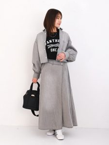 軽やかな素材感が特徴のグレーのデニムシャツジャケット&ロングスカートのセットアップ。ゆとりのあるシルエットで今っぽく、ロゴ入りブラックTシャツがカジュアルなアクセントに。ブラックバッグとホワイトスニーカーで引き締めつつ、さりげなくエレガントな印象もプラスします。ショッピングやカフェ巡りにぴったりな、大人のカジュアルスタイルです。