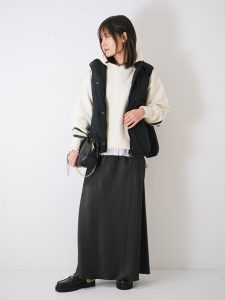 春はパステルカラーやベージュ、ホワイトといった明るめカラーが増えてきます。このような時も、ボトムスにダークカラーを選んだり、ジレやベストなどにブラック、ネイビーを選ぶことでコーディネート全体を引き締めてくれます。明るいカラーは春らしさを与えてくれますが、トーンによっては膨張色になってしまうので小物使いなどを工夫すると良いでしょう。小物やカラーの使い方、選び方がスタイリッシュに見せるポイントにつながりますよ。