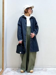 アウターにはデニム素材のロングコートを羽織り、程よくカジュアルダウンしながらも上品な印象をプラス。