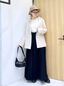 インナーはシンプルなホワイトのトップスで統一感を持たせ、帽子と眼鏡をアクセントにすることでクラシックな雰囲気をプラスしています。