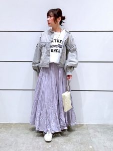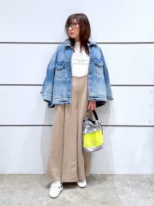 ベージュと白はどちらも柔らかい色なので、素材に変化を加えて立体感を出すことができます。また、全体が単調に見えないように、シルエットを意識してバランスを取ることも大切。特に、ベージュのアイテムの分量が多い場合、シンプルなラインのものや、コクーン型など、体のラインを引き立てるシルエット選びが効果的です。デニムジャケットを肩掛けにすることで、アクセントとしても楽しめますね。