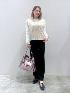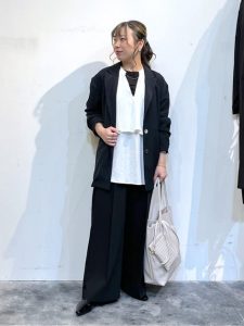 春は、オーケージョンスタイルなどきちんとしたコーディネートの出番が増えますね。同じアイテムでコーディネートする時、インナーの選び方によって印象を変えることができます。オケージョンスタイルでは、モノトーンカラーを選ぶことが多いのではないでしょうか。モノトーンカラーの場合も、白、黒のどちらのカラーの分量を多くするかによって全体の雰囲気が変えて楽しむことができますね。