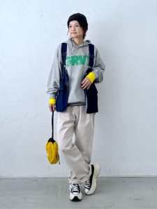 グリーンのロゴ入りパーカーに、程よいゆとりのベージュパンツを合わせたリラックスカジュアルスタイル。個性的なデザインのデニムベストも、ポップなロゴのおかげでバランスよく着こなせます。グリーンと相性の良いイエローのインナーやバッグを加えることで、春らしさがアップ。動きやすく、アウトドアにもぴったりなスタイリングです。