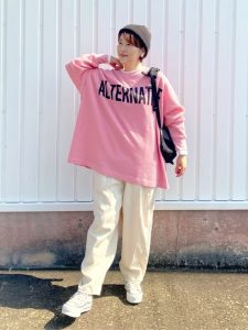 大きなピンクのロゴに合わせて、袖口からもピンクのインナーをチラ見せ。さらにニットキャップもピンクをセレクトして、ポップ&キュートな着こなしに仕上げています。肩紐が長めのジャンパースカートなので、ロゴがしっかりと見えるのもポイント。ピンク以外はブラックとグレーでシンプルにまとめると、インパクトのあるロゴスウェットが引き立ちますね。