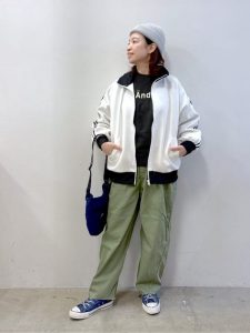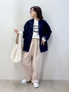 ネイビー地にイエローの大きなロゴが入ったトップスは、クールでスポーティなイメージ。ヒッコリー柄のサスペンダーパンツと合わせて、とことんボーイッシュに着こなしています。アウターはオフホワイトを選び、春らしく軽やかに仕上げているのもポイント。イエローの補色であるブルーのスニーカーも、センスアップに一役買っています。
