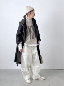 グレー地×ベージュロゴのプルオーバーに、アイボリーのベイカーパンツを合わせたゆるめカジュアルスタイル。ビッグなロゴが入ったトップスは一見難しそうですが、ナチュラルな色味を選べば大人世代も抵抗なく着こなせます。ブラックのロングアウターを羽織って、ほんのりメンズライクにまとめて。