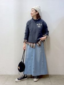 ロゴトップス×デニムの鉄板カジュアルコーデも、スカートを選ぶとほんのり女性らしい雰囲気に。左胸にさり気なくロゴが入ったプルオーバーなら、子供っぽい印象にならずに着こなせます。トップスの裾からはチェックシャツをチラ見せして、ベーシックな配色にアクセントをプラス。お花見やピクニックなど、春の行楽におすすめしたいコーディネートです。
