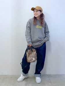 落ち着いたチャコールグレーの色味に、イエローのロゴが映えるこちらのスウェット。流れるようなラインの筆記体のロゴは、コーディネートに大人のこなれ感をプラスしてくれます。キャップ、デニム、スニーカーの王道カジュアルスタイルを、レオパード柄のポーチでほんのり辛口に。足元はホワイトのシューズで、春らしく軽やかに仕上げています。