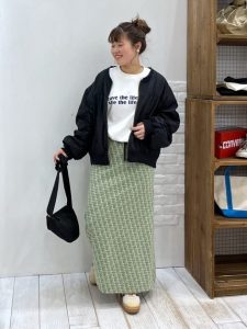 丸みのある小さめのフォントのロゴスウェットは、フェミニンなプリントスカートとの相性抜群。レディな印象のスカートがほどよくカジュアルダウンされ、お散歩やカフェ巡りにもぴったりな大人可愛いスタイリングに仕上がっています。トップスはウエストイン、さらにショート丈のブルゾンを羽織って上半身をコンパクトにまとめることで、スタイルアップが叶いますね。