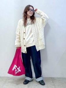 ロゴトップスをナチュラルに着こなしたい方には、ソフトであたたかみのあるアイボリーがおすすめ。素朴な編み目のケーブルニットカーディガン、ゆるめシルエットのデニムを合わせれば、ほっこり可愛いカジュアルコーデが完成します。シンプルな配色に、鮮やかなピンクのバッグでアクセントをプラス。足元はローファーを選び、ほんのりクラシカルに仕上げています。