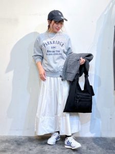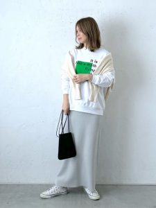 鮮やかなグリーンの配色が目を引くロゴスウェットは、他をシンプルなカラーでまとめて大人っぽく着こなして。ホワイト×ライトグレーのソフトな配色も、グリーンのおかげでメリハリが生まれます。こちらのスウェットはロゴが小さめなので、フェミニンなスカートスタイルにもしっくりとなじんでくれます。