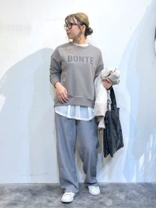 肌なじみの良いアッシュグレーのロゴスウェットは、同じグレーのパンツを合わせて大人のワントーンコーデに。ラメ入りの発泡プリントのロゴが、のっぺり見えがちな配色にさり気ない立体感を与えてくれます。ホワイトのカットソーをレイヤードすると、春らしく爽やかな雰囲気がアップしますね。