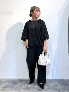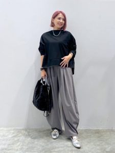 1-2.ゆったりシルエットのトップスはメリハリあるカラー使いですっきりと